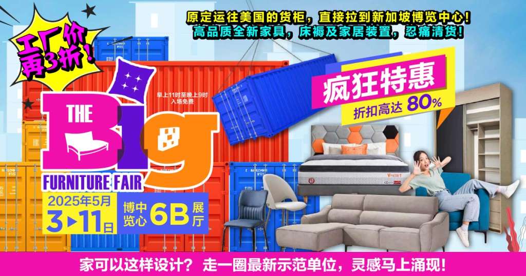 好消息!原定运往美国的货柜,由于关税问题,已经转运到新加坡博览中心,5月3号起在The BIG 新家大不同家具与装修展上,不计成本,忍痛大倾销!大批最新款式的家具、高级床褥及家庭用品,低于工厂价出售!机会千载难逢,售完为止!