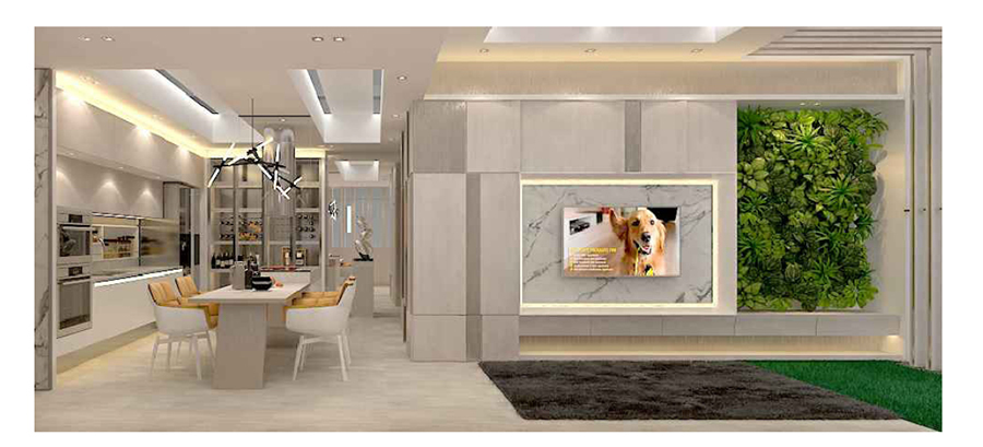 A deliberate use of marble is seen throughout the home – from the TV feature wall and display niche in the living room (which hides a discreet shoe cabinet) to the island kitchen and master bedroom – to create a luxurious mood.