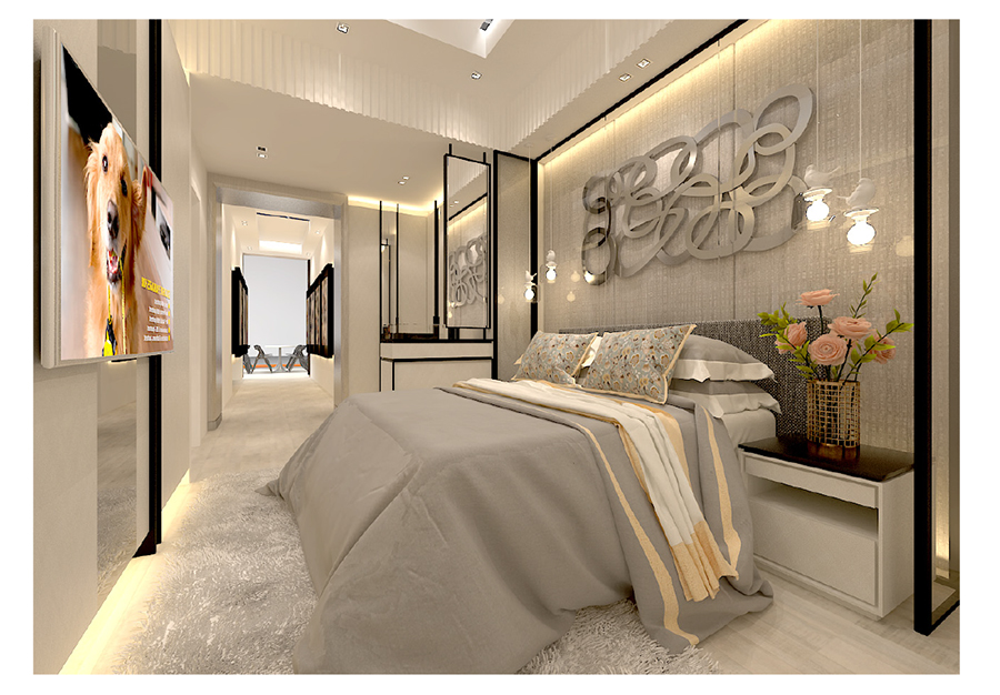 The main focus of the master bedroom is the extension of the headboard where a celebration of details can be seen. A unique combination of glass, art installation and cushion panel helps to create a multi-dimensional effect. The glass and mirror mix creates the illusion of brighter, wider space and the cove lighting is the icing on the cake for the ensuing air of sophistication.