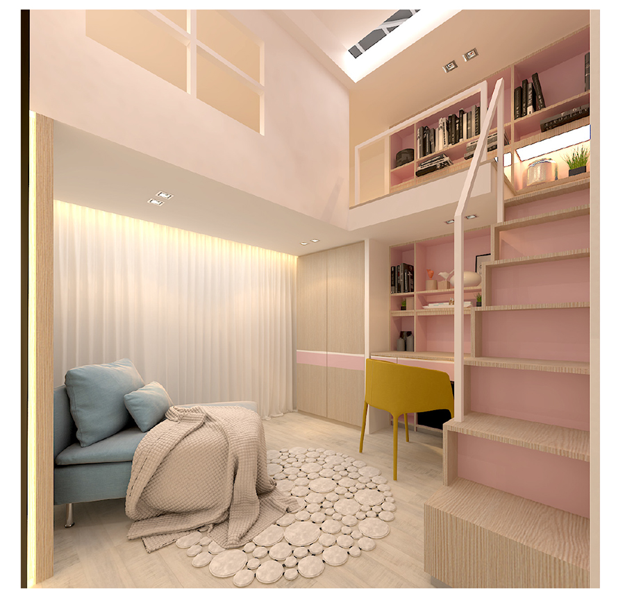 Any youngster would love to have a room like this to him or herself. The loft design not only creates a private enclave where the bed occupies the upper level but the clever use of wall to create storage and shelves means there’s ample space for books, toys and games.